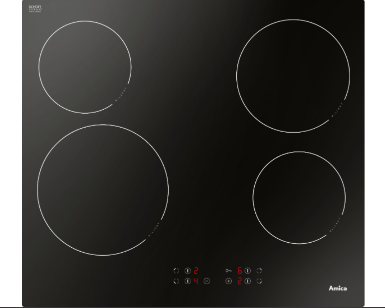 Sklokeramická deska Amica DS 6401 B po vypnutí zajistí rozsvícení symbolu H, který indikuje horké pole. Dalším bezpečnostním opatřením je i dětský zámek, který slouží k ochraně vypnuté desky proti nechtěnému zapnutí.